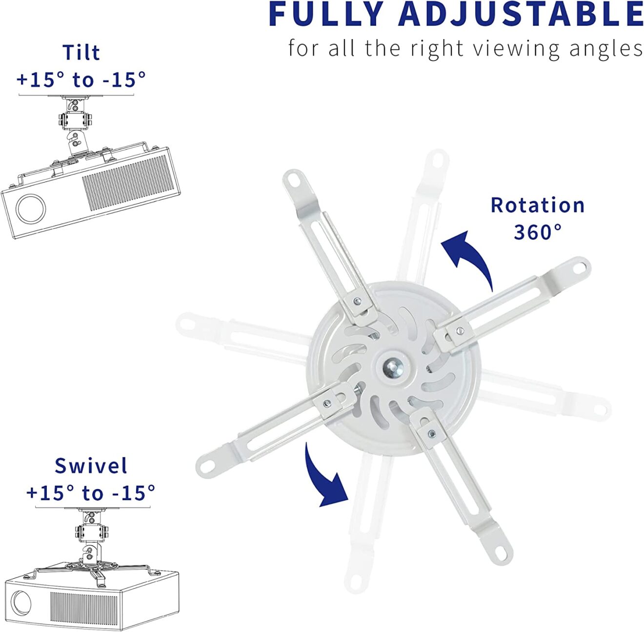 WALI Universal Ceiling Projector Mount is made of high-grade steel, has a sturdy construction and adjustable extension arms, is capable of mounting most projectors on the market, and can hold up to 30 lbs.
