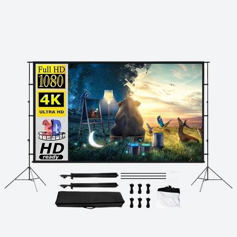 150 inch projector screen with two lightweight, foldable and stable tripods, our stand is extremely easy to set up and take down. It’s extremely convenient and portable for your outdoor, camping and travelling experiences