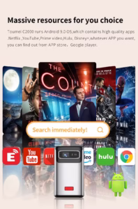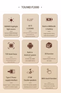 Model name : P2000 LED Mini Projector Operating system: Android 9.0 CPU: MTK Decode 4K H265/AVS2 4K*2K*30HZ RAM: 2GB ROM: 32GB BT: BT5.0,USB2.0 WiFi : 2.4GHz/5GHz Dual Band WiFi Resolution:QHD 960*540P Brightness: 180ANSI(5400Lumens) Contrast Ratio: 1000:1